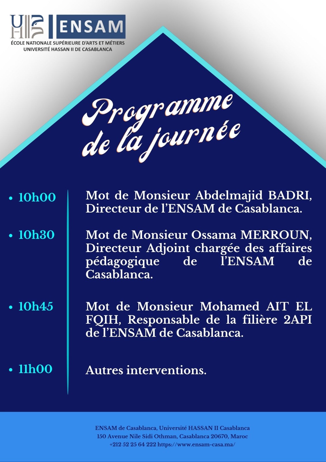 - 10h45 : Mot de Monsieur Mohamed AIT EL FQIH, Responsable de la filière 2API de l’ENSAM de Casablanca.